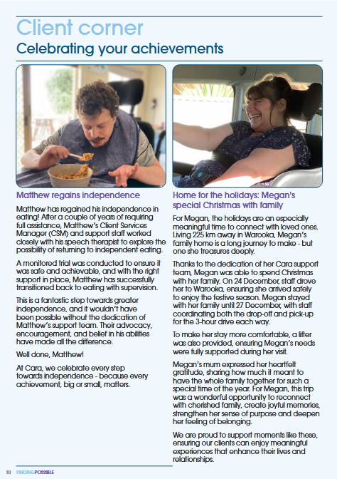 Matthew’s journey back to independent eating and Megan’s meaningful Christmas with family showcase Cara’s dedication to person-centred support. Through collaboration, advocacy, and planning, our teams help clients achieve goals that enhance independence and strengthen relationships.