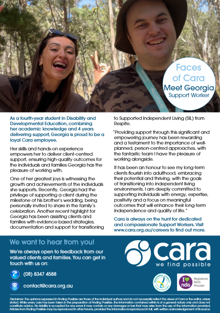 Georgia combines her academic knowledge as a fourth-year Disability and Developmental Education student with four years of hands-on experience to deliver exceptional, person-centred support.